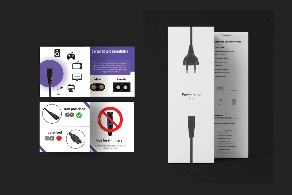 Power Pro: Minimalist Excellence. Disrupting with an Apple-inspired package, black and white radiate professionalism. Artful cable showcasing, concise 'Power Cable (1m)' and bold 'Power Pro' branding make a statement of elegance. Challenges met strategically, setting us apart.